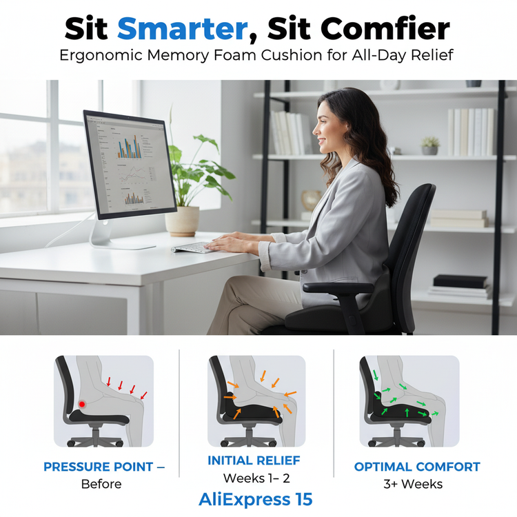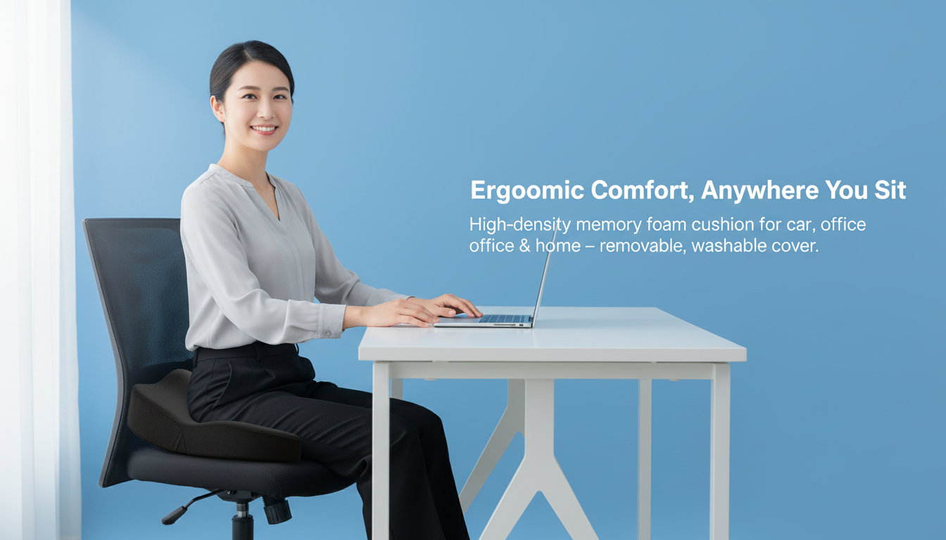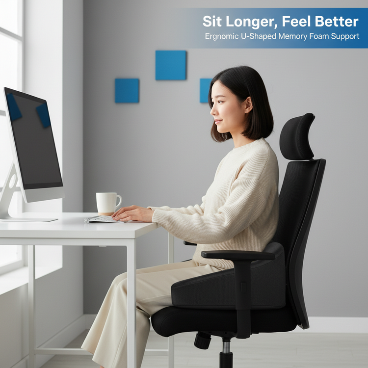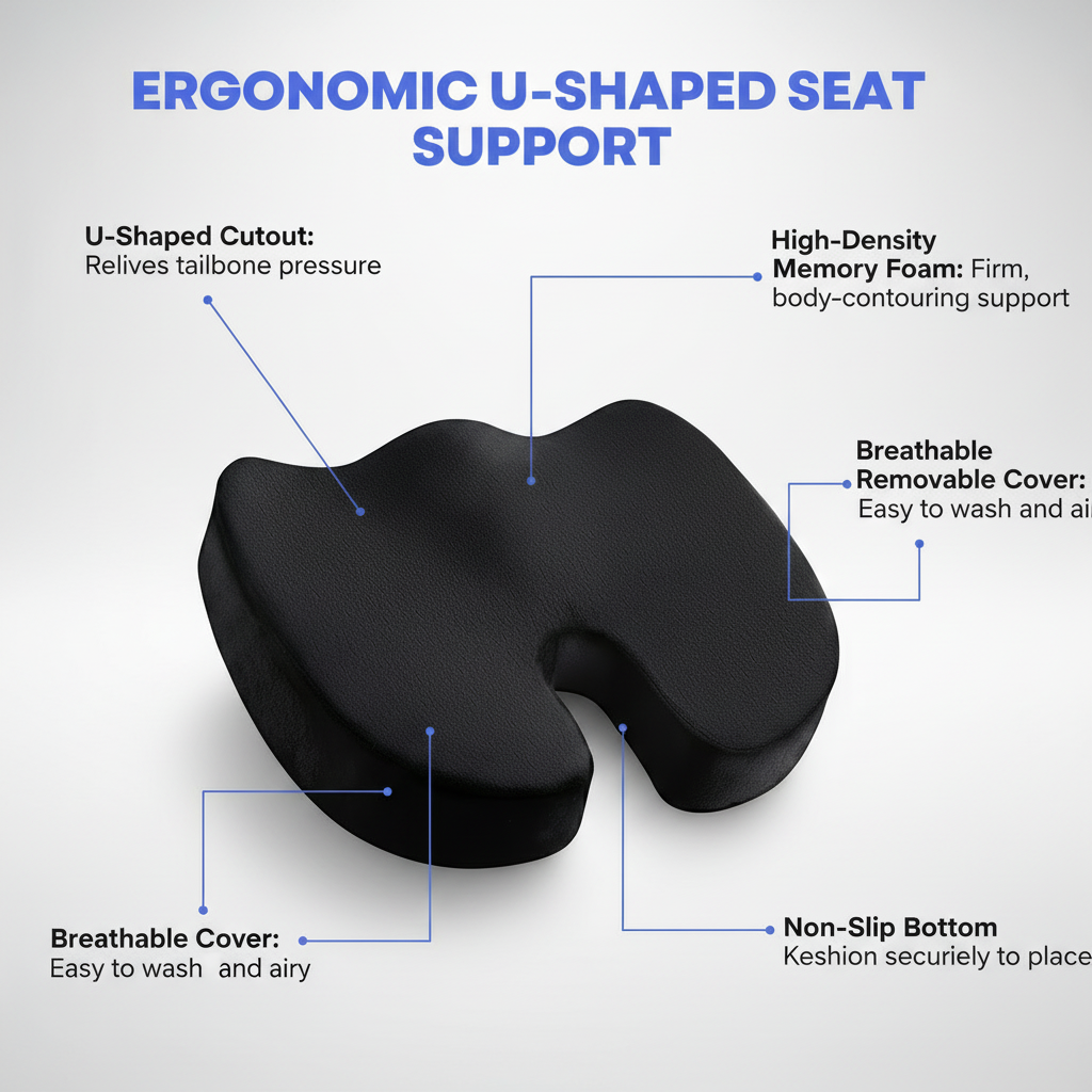 Our U-shaped design and high-density memory foam specifically target tailbone relief and ergonomic support for prolonged sitting.